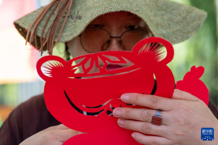 7月29日,在黑龍江東北虎林園,剪紙藝人現場制作以“虎”為主題的作品。