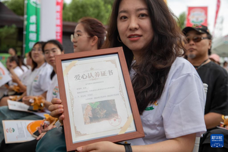 7月29日,在黑龍江東北虎林園,人們展示愛心認養證書。