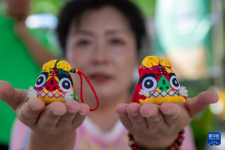7月29日,在黑龍江東北虎林園,手藝人現場展示以“虎”為主題的手工布藝作品。