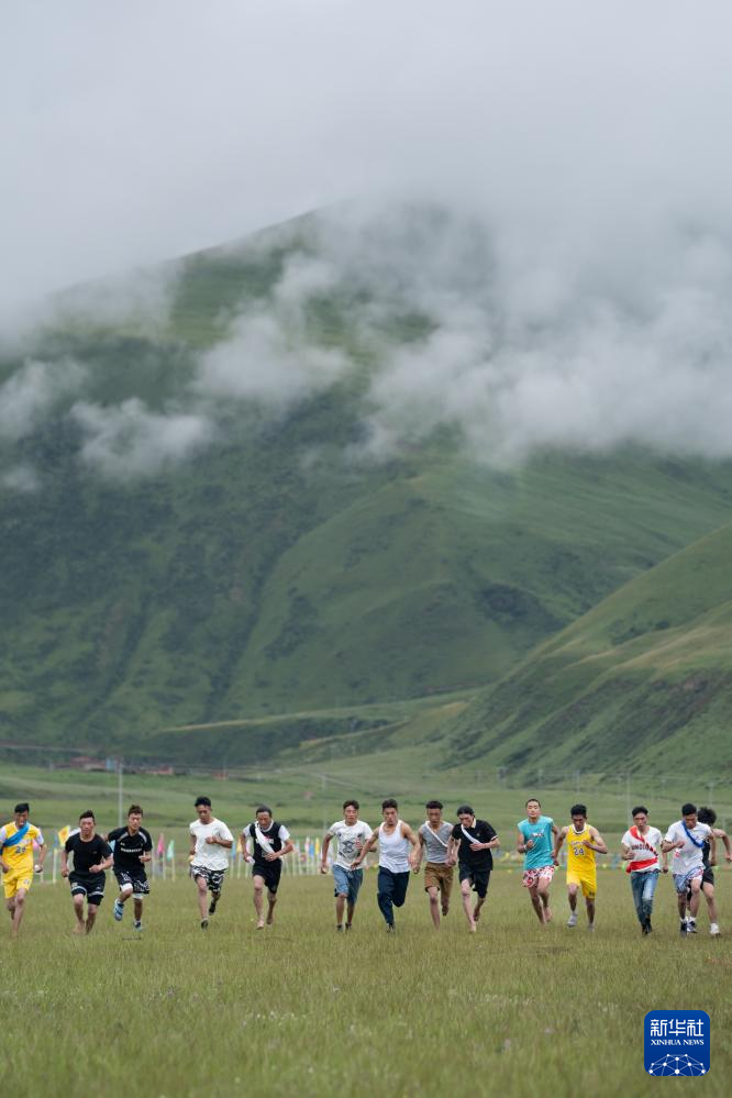 7月28日,當地小伙子們在參加1公里“天空跑”。