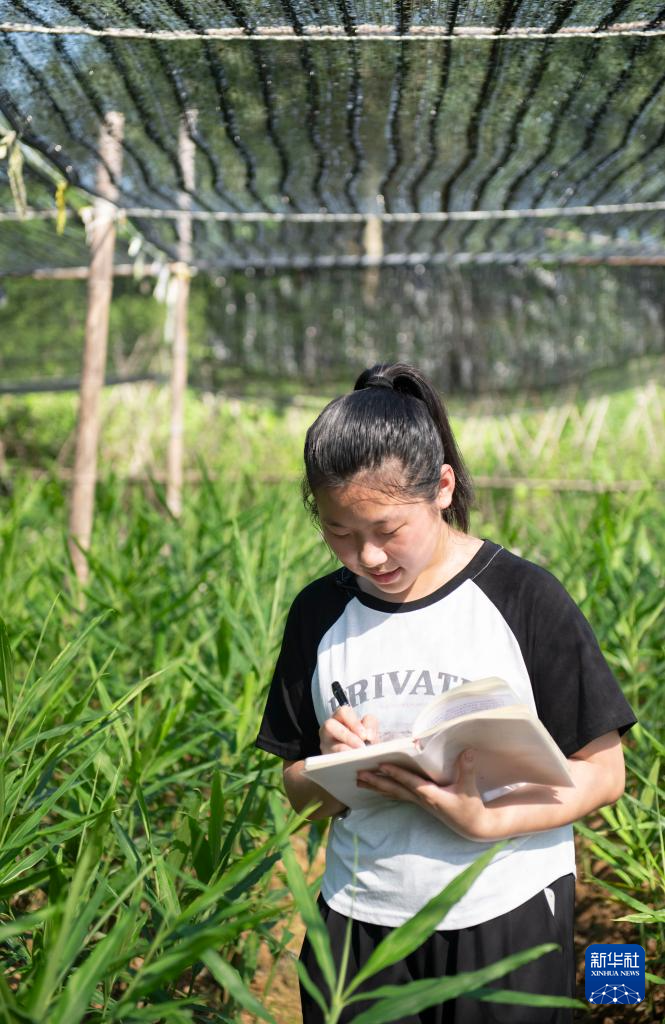 7月24日,在安徽省銅陵市義安區(qū)天門鎮(zhèn)新華村,朱晴雨展示記錄著銅陵白姜相關(guān)知識的筆記本。新華社記者 張端 攝