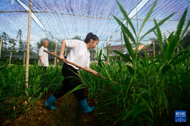 7月24日,在安徽省銅陵市義安區(qū)天門鎮(zhèn)新華村,朱晴雨在自家白姜田里拔雜草。新華社記者 傅天 攝