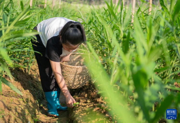 7月24日,在安徽省銅陵市義安區(qū)天門鎮(zhèn)新華村,朱晴雨在自家白姜田里觀察姜苗狀態(tài)。新華社記者 張端 攝