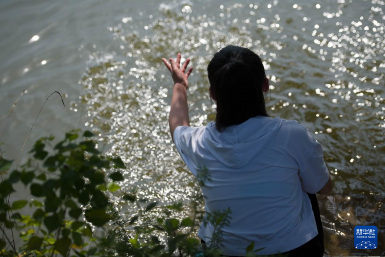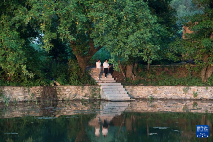 7月23日,在安徽省銅陵市郊區(qū)大通鎮(zhèn)大院村,朱晴雨(右)和媽媽在池塘邊休閑。新華社記者 張端 攝