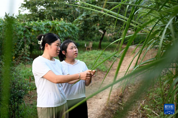 7月23日,在安徽省銅陵市郊區(qū)大通鎮(zhèn)大院村,朱晴雨(右)向媽媽請教芭茅草的特點。新華社記者 傅天 攝