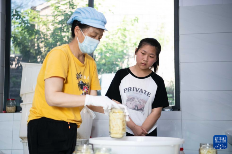 朱晴雨六七歲時就跟著媽媽許紅麗在姜田里拔雜草。看著雜草逐漸填滿籃子,年幼的她體會到了勞動帶來的快樂。她喜歡待在姜田里,看看葉片的樣子,瞧瞧上面的蟲眼,然后把自己的觀察寫在周記里。“我和姜苗就像朋友一樣,互相陪伴著長大。”朱晴雨說。從白姜的種植、收獲,到腌制、包裝,朱晴雨全程參與。力氣小的她還不能輕松揮動鋤頭,就多干一些除草、刮姜、攪拌糖醋、疊包裝盒等較為輕松的勞動,幫家人減輕負擔。
