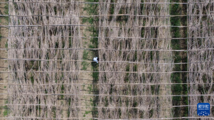7月23日,在安徽省銅陵市義安區(qū)天門鎮(zhèn)龍山村,朱晴雨在采用芭茅搭棚遮陰傳統(tǒng)方法的白姜田里勞作(無人機照片)。新華社記者 傅天 攝