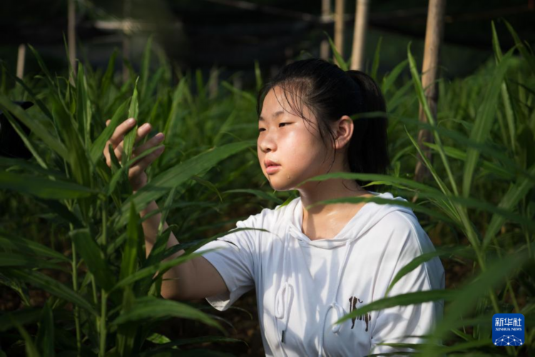 7月23日,在安徽省銅陵市義安區(qū)天門鎮(zhèn)新華村,朱晴雨在自家白姜田里觀察姜苗。新華社記者 張端 攝