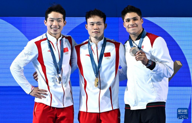 8月8日,金牌得主中國選手謝思埸(中)、銀牌得主中國選手王宗源(左)和銅牌得主墨西哥選手奧斯馬爾在頒獎儀式上合影。新華社記者 王鵬 攝