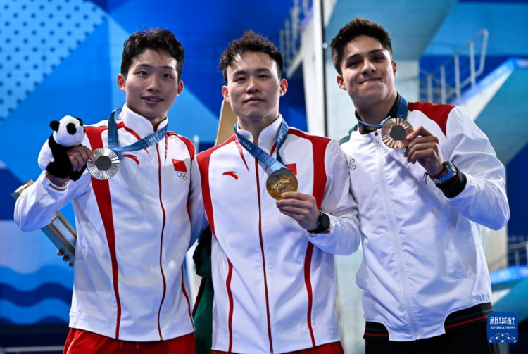 8月8日,金牌得主中國選手謝思埸(中)、銀牌得主中國選手王宗源(左)和銅牌得主墨西哥選手奧斯馬爾在頒獎儀式上合影。新華社記者 王鵬 攝