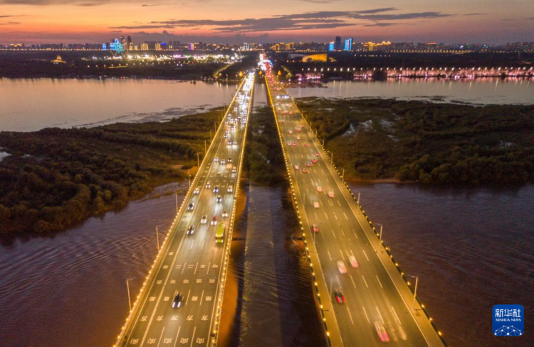 8月15日,車輛在晚霞映照的哈爾濱松花江公路大橋上行駛(無人機照片)。