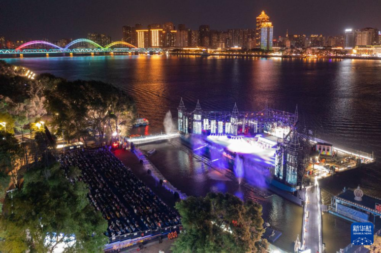觀眾在松花江畔觀看《遇見·哈爾濱》江上沉浸式演藝(6月10日攝,無人機(jī)照片)。