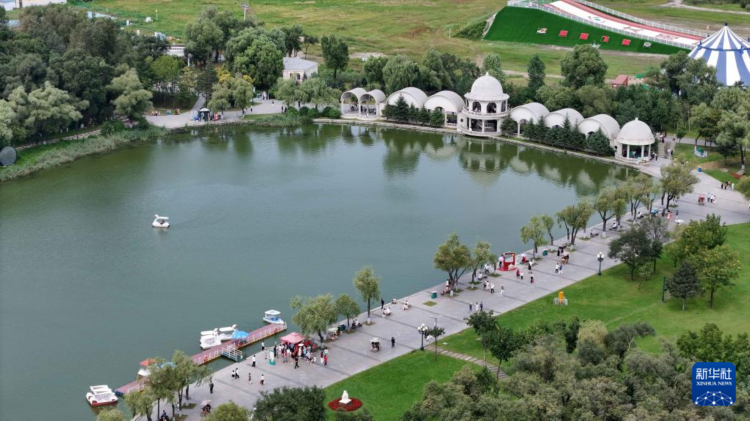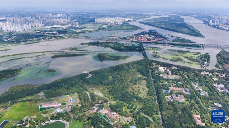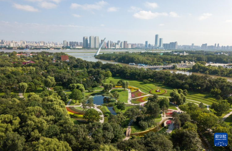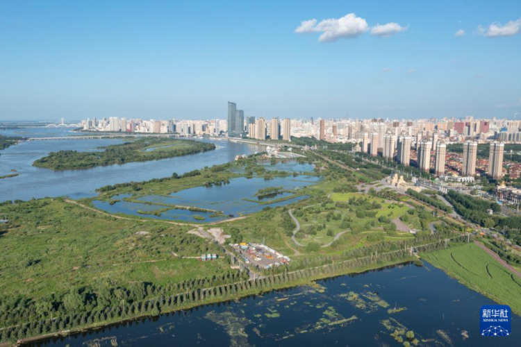 這是哈爾濱群力外灘生態(tài)濕地公園一角和周邊城市景觀(8月13日攝,無人機(jī)照片)。