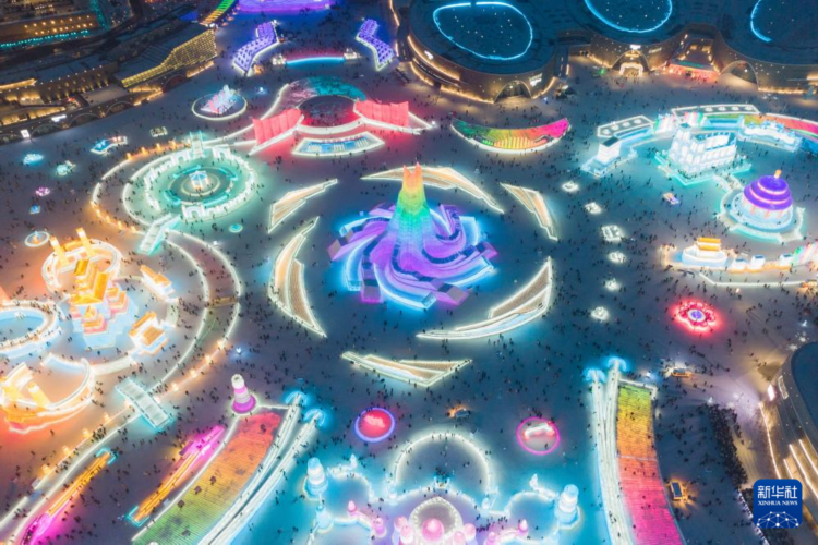 游客在哈爾濱冰雪大世界園區(qū)游玩(1月1日攝,無人機(jī)照片)。