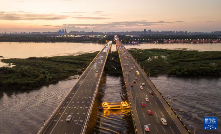 車輛在哈爾濱松花江公路大橋上行駛,一艘游船從橋下經(jīng)過(8月15日攝,無人機(jī)照片)。