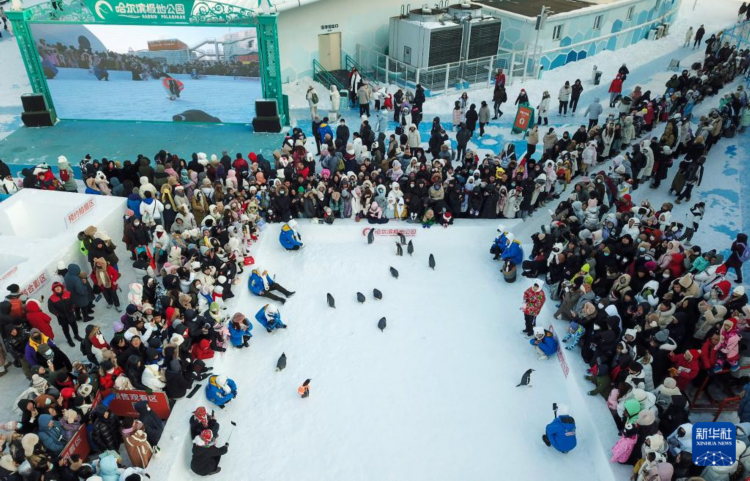 游客在哈爾濱極地公園廣場觀看企鵝巡游(1月5日攝,無人機(jī)照片)。