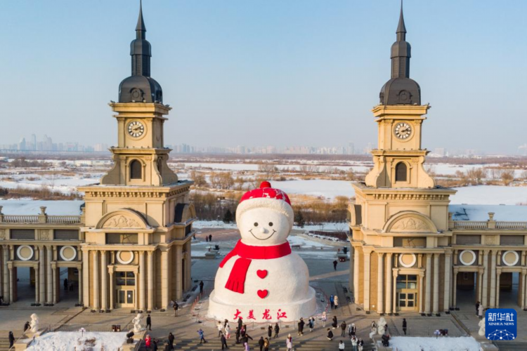 在哈爾濱群力音樂公園,游客參觀“網(wǎng)紅”大雪人(1月5日攝,無人機(jī)照片)。