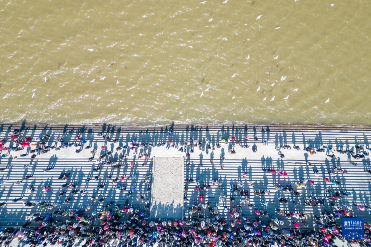 人們在哈爾濱市松花江畔欣賞江鷗和江景(4月19日攝,無人機照片)。