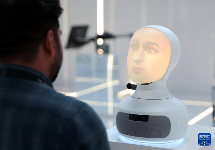 9月12日,在沙特阿拉伯首都利雅得舉行的第三屆全球人工智能峰會上,一名參會者與“對話機器人”交流。