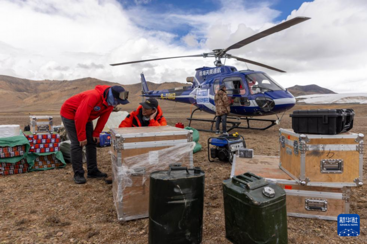 9月9日,徐柏青(中)和同事安排直升機將科考物資從海拔5400米的第二次青藏科考普若崗日冰原大本營運往海拔6100米的“Dome.C”點。