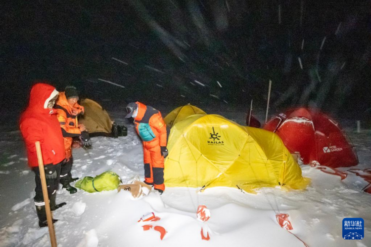 科考隊員在夜間的大風雪中加固營地(9月11日攝)。