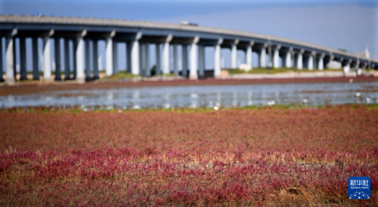 這是位于遼寧省錦州市凌海市紅海灘國家風景廊道凌海大橋下方的紅海灘(9月14日攝)。