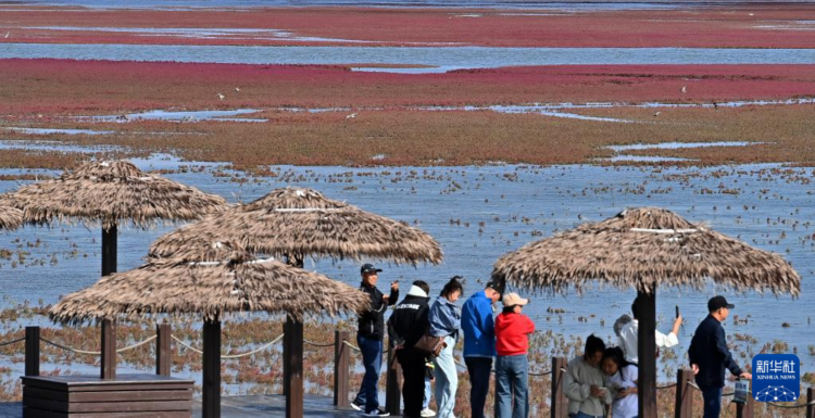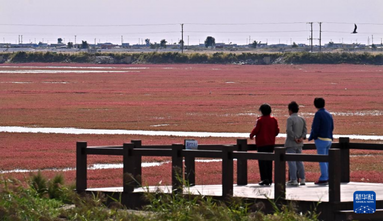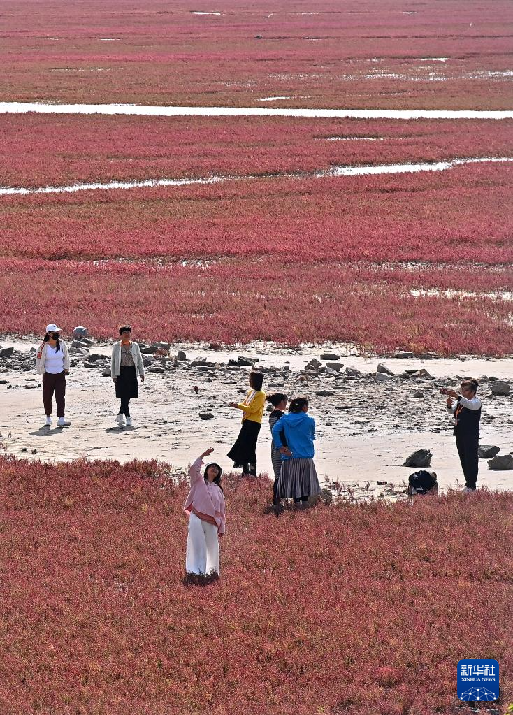 9月14日,游客在遼寧省錦州市凌海市紅海灘國家風景廊道欣賞紅海灘。