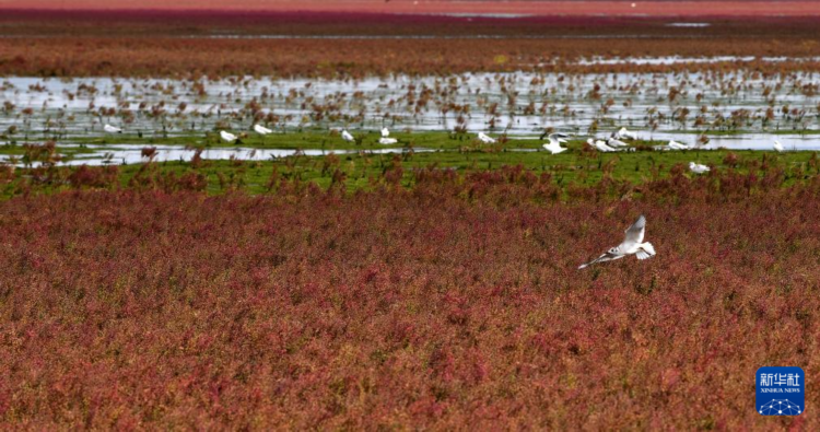 9月14日,海鳥在遼寧省錦州市凌海市紅海灘國家風景廊道紅海灘上空飛翔。