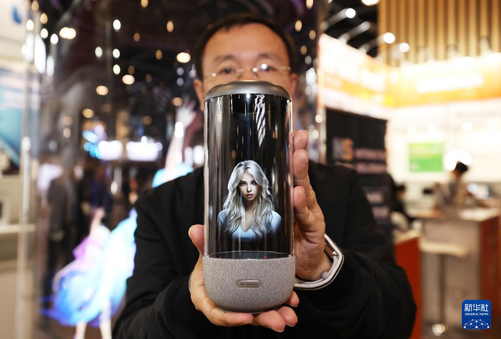 9月17日,在法國巴黎凡爾賽門展覽中心舉行的“中國貿促”(法國)創新合作展覽會上,工作人員展示中國人工智能全息數字人一體機的某款產品。