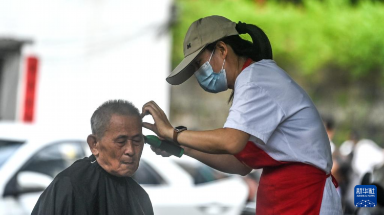 9月22日,青年志愿者(右)在欽州老街給一位老人免費理發。
