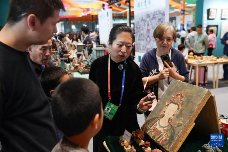 9月22日,在匠心傳承·創意綻放——非遺及文創精品展上,敦煌石粉彩繪非遺傳承人為游客介紹一件敦煌壁畫文創產品。