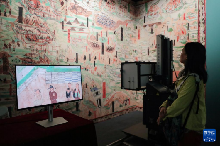 9月22日,在敦煌研究院“典范”“高地”建設成果展上,游客參觀莫高窟壁畫高保真自動拍攝裝置。