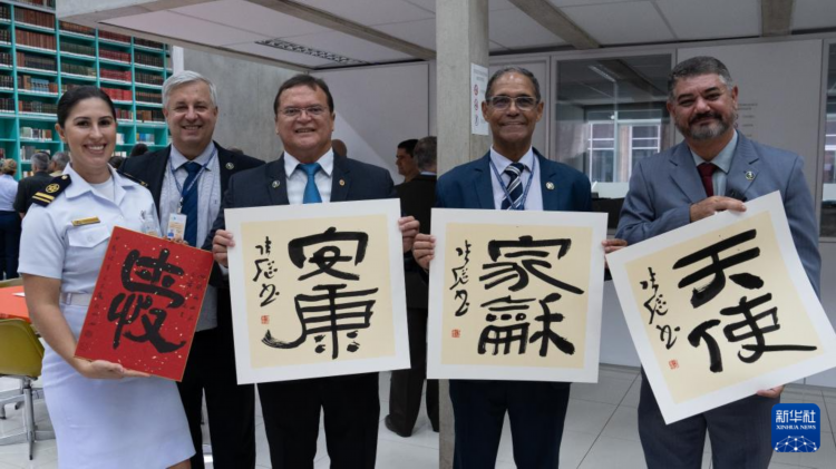9月23日,在巴西首都巴西利亞高等防務(wù)學(xué)院舉行的“中國日”活動上,嘉賓手持書畫創(chuàng)作員的作品合影。