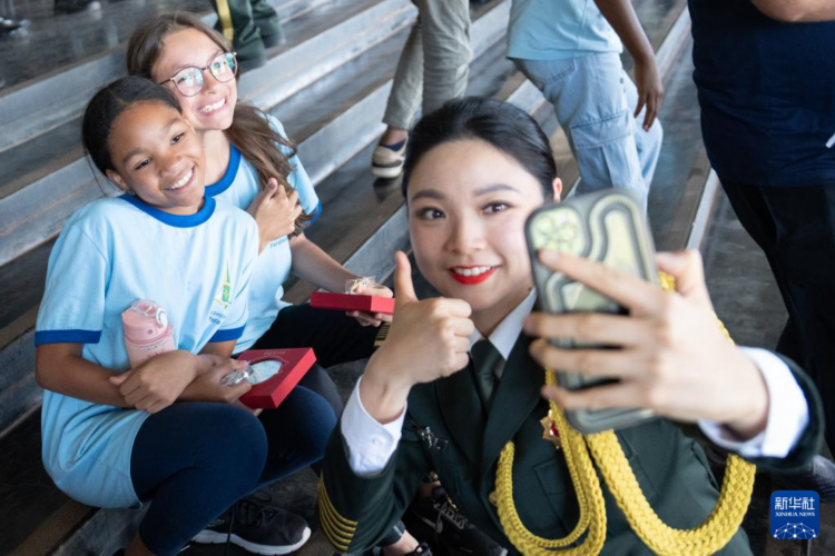 9月23日,在巴西首都巴西利亞高等防務(wù)學(xué)院舉行的“中國日”活動上,中國人民解放軍國際傳播代表團的軍樂分隊隊員與巴西觀眾合影。