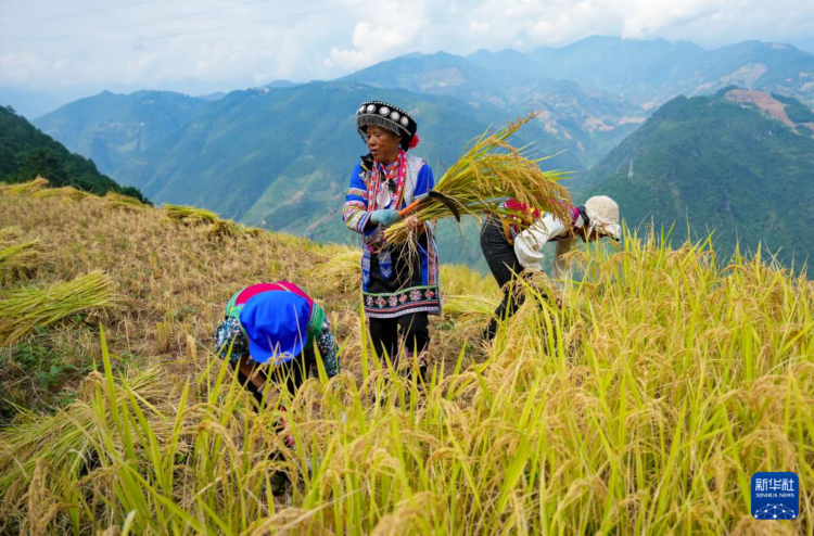 9月24日,怒江州瀘水市大興地鎮自基村村民在旱地優質稻稻田里割稻谷。