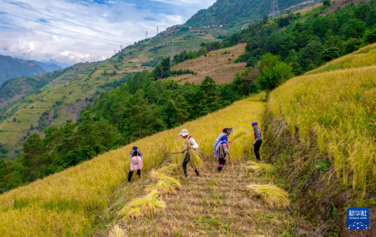 9月24日,怒江州瀘水市大興地鎮自基村村民在旱地優質稻稻田里割稻谷(無人機照片)。