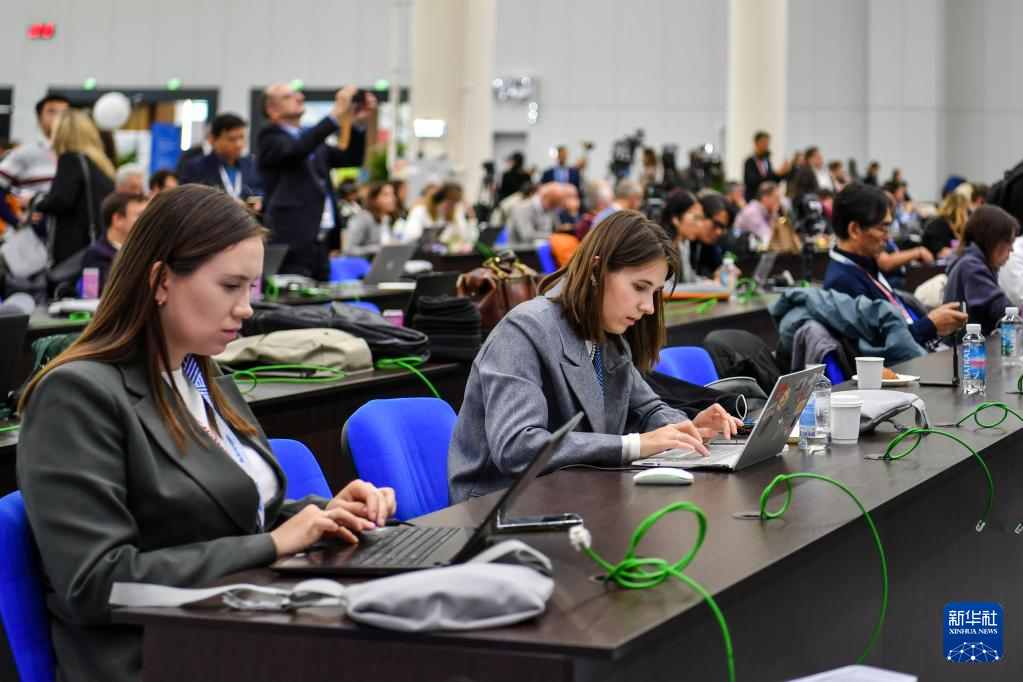 10月22日,媒體工作人員在俄羅斯喀山金磚峰會新聞中心工作。 當日,金磚峰會新聞中心正式運營。峰會新聞中心是注冊記者的主要工作場所,提供新聞發布、技術保障、信息咨詢、餐飲及交通等服務。 新華社記者 曹陽 攝