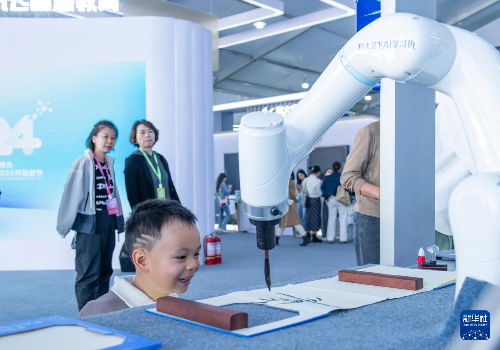 10月24日,一名兒童在第七屆世界聲博會上參觀一款國畫書法機器人。 新華社記者 傅天 攝