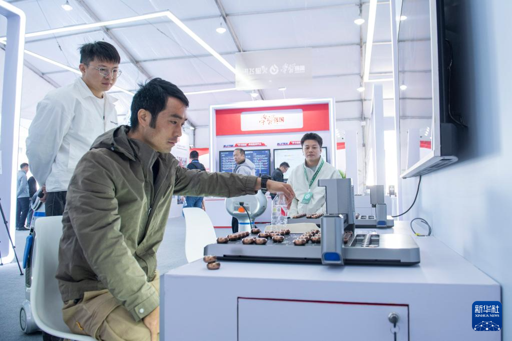 10月24日,觀眾在第七屆世界聲博會上與一款象棋機器人互動。 新華社記者 傅天 攝
