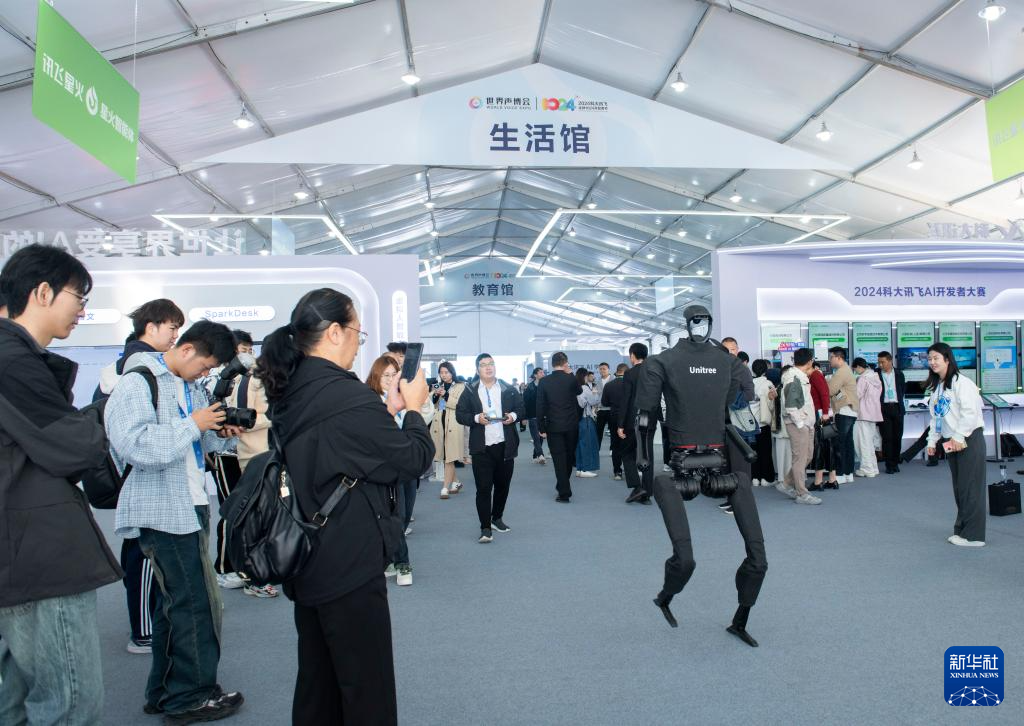 10月24日,在第七屆世界聲博會上,一款人形機器人在場館內進行“行走”展示。 新華社記者 傅天 攝