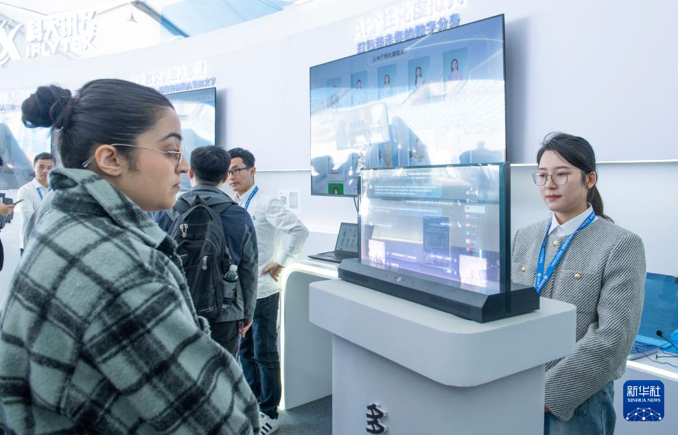 10月24日,觀眾在第七屆世界聲博會上體驗一款多語種AI透明屏。 當日,第七屆世界聲博會暨2024科大訊飛全球1024開發者節在合肥開幕。本屆聲博會為期4天,同期舉辦人工智能產品創新展,設置科技館、工業館、教育館、生活館等8個主題展館。前沿人工智能技術與產品亮相展會,吸引不少觀眾到場參觀體驗,了解人工智能在工業、教育、休閑娛樂等領域的應用。 新華社記者 傅天 攝