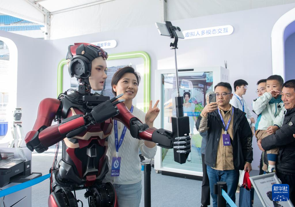 10月24日,在第七屆世界聲博會上,一款人形交互機器人持自拍桿與觀眾合影。 新華社記者 傅天 攝
