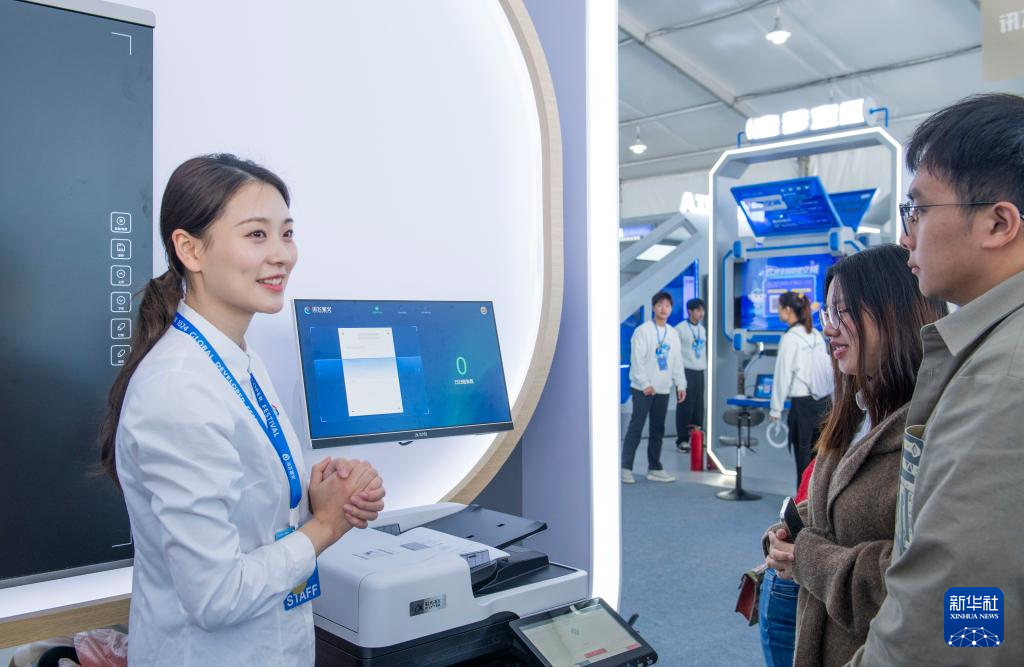 10月24日,工作人員(左一)在第七屆世界聲博會上向觀眾介紹一款智能批閱機。 新華社記者 傅天 攝