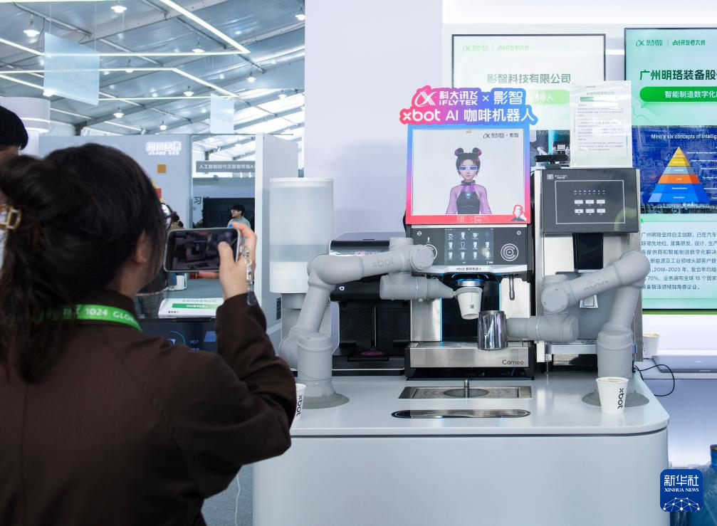 10月24日,觀眾在第七屆世界聲博會上參觀一款AI咖啡機器人。