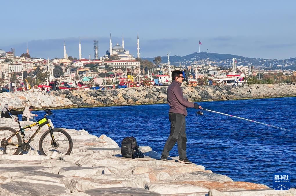10月26日,一名男子在土耳其伊斯坦布爾的馬爾馬拉海邊釣魚(手機照片)。