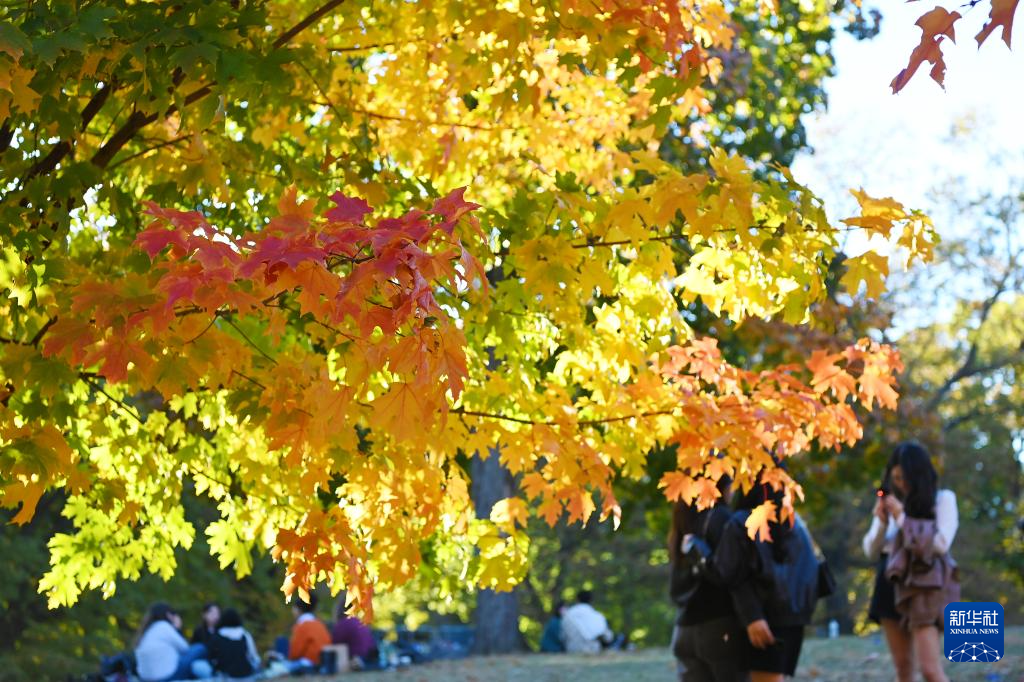 11月2日,人們?cè)诿绹~約中央公園秋葉前留影。