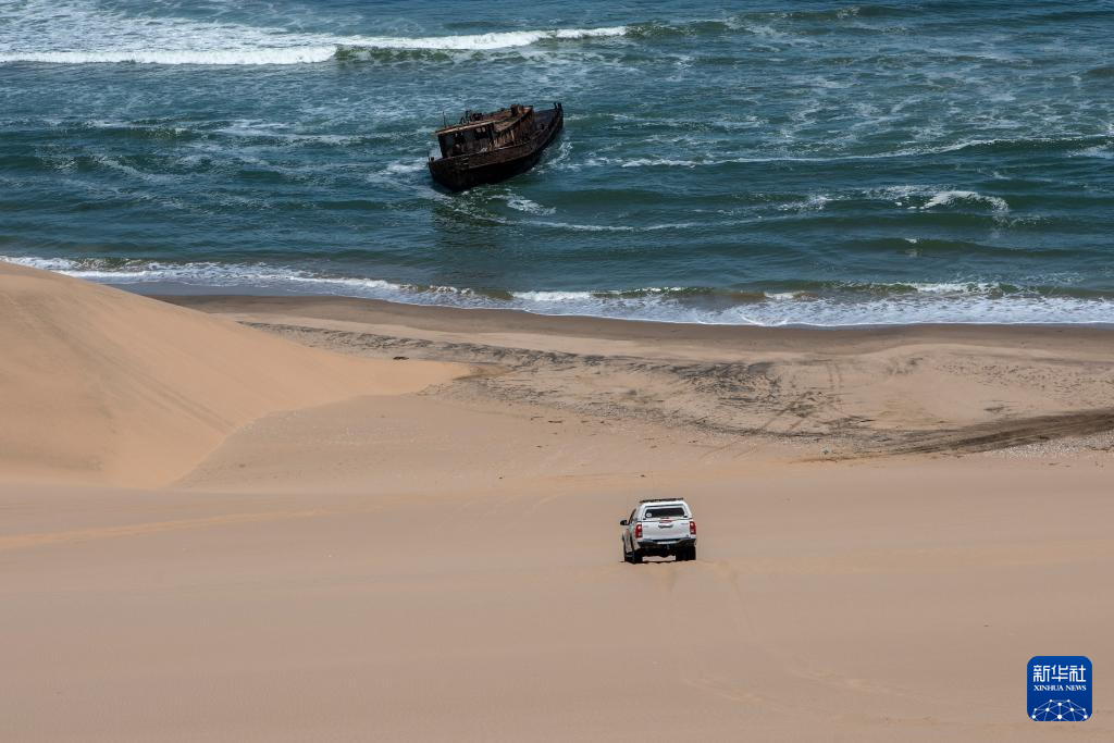 11月2日,在納米比亞納米布-諾克盧福國家公園,車輛在一處船只殘骸景點旁行駛。