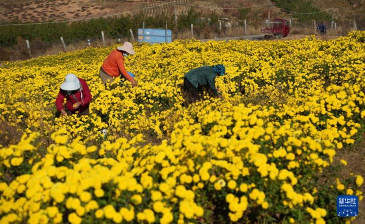 立冬時節,山東省新泰市菊花進入采摘期,當地種植戶趁晴好天氣忙著采收菊花。