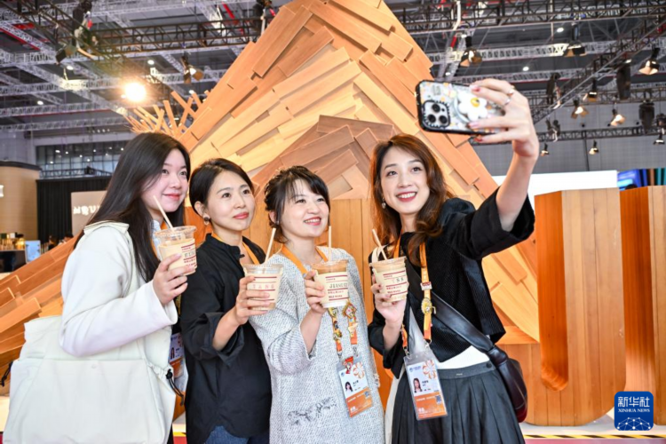 11月7日,參展商在第七屆進博會消費品展區合影。