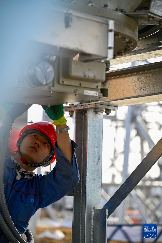 工人在新疆民豐750千伏變電站施工現(xiàn)場作業(yè)(11月10日攝)。
